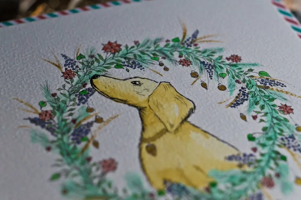 Kartka świąteczna „Biszkoptowy pies” to ręcznie wykonana, rozkładana kartka, idealna do podarowania bliskim czy wysłania do rodziny z okazji świąt. Nie zawiera symboli religijnych. Została przygotowana przy użyciu rozkładanej bazy (wewnątrz jest biała, bez zapisanych życzeń), papieru w czerwono-zielone, połyskujące linie i ręcznie malowanej akwareli. Rysunek przygotowany z użyciem farb akwarelowych tradycyjnych i metalicznych, a także tuszu, przedstawia biszkoptowego psa siedzącego dumnie w świątecznym wianku.