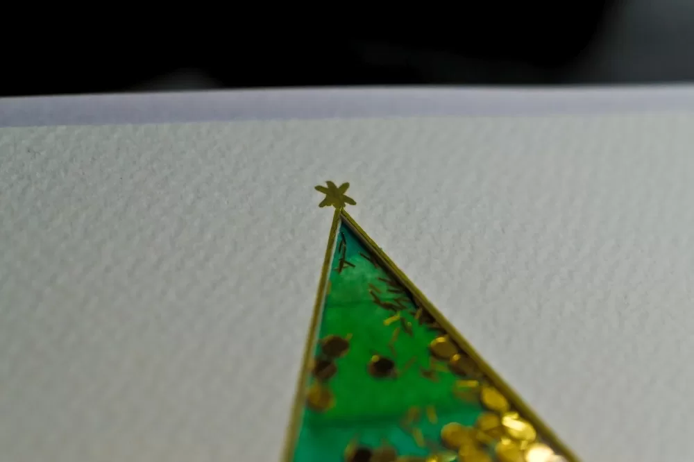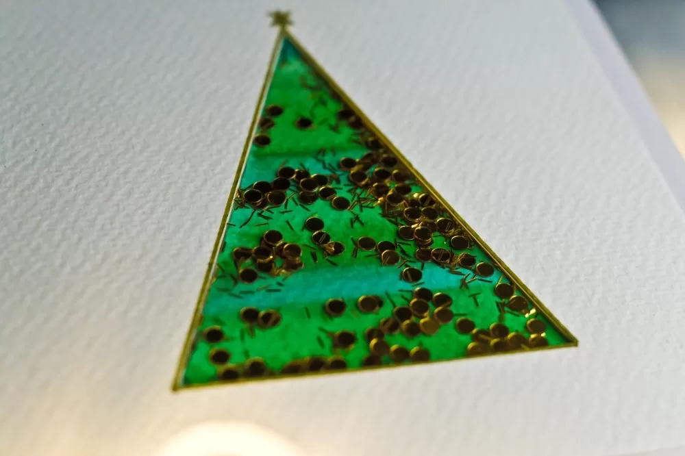 Kartka świąteczna „Złote drzewko” to ręcznie wykonana, rozkładana kartka, idealna do podarowania bliskim czy wysłania do rodziny z okazji świąt. Nie zawiera symboli religijnych. Została przygotowana przy użyciu rozkładanej bazy (wewnątrz jest biała, bez zapisanych życzeń), ręcznie malowanej choinki (akwarela), ozdobionej ramki z papieru akwarelowego (brokatowy tusz) i okienka z ruchomym, złotym brokatem.